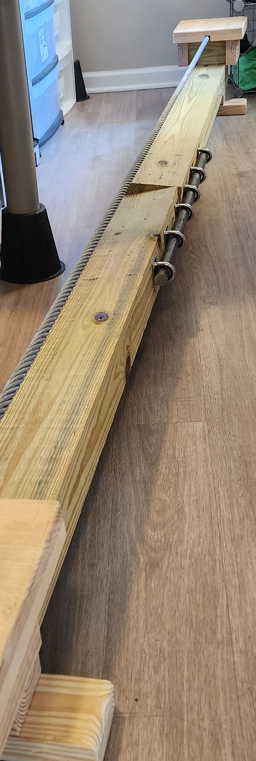 - scrap 2x4 lumber to make two feet. One 2x4 needs a channel cut for the cable. Second 2x4 is stacked and wide enough to prevent beam from rotating while in use.