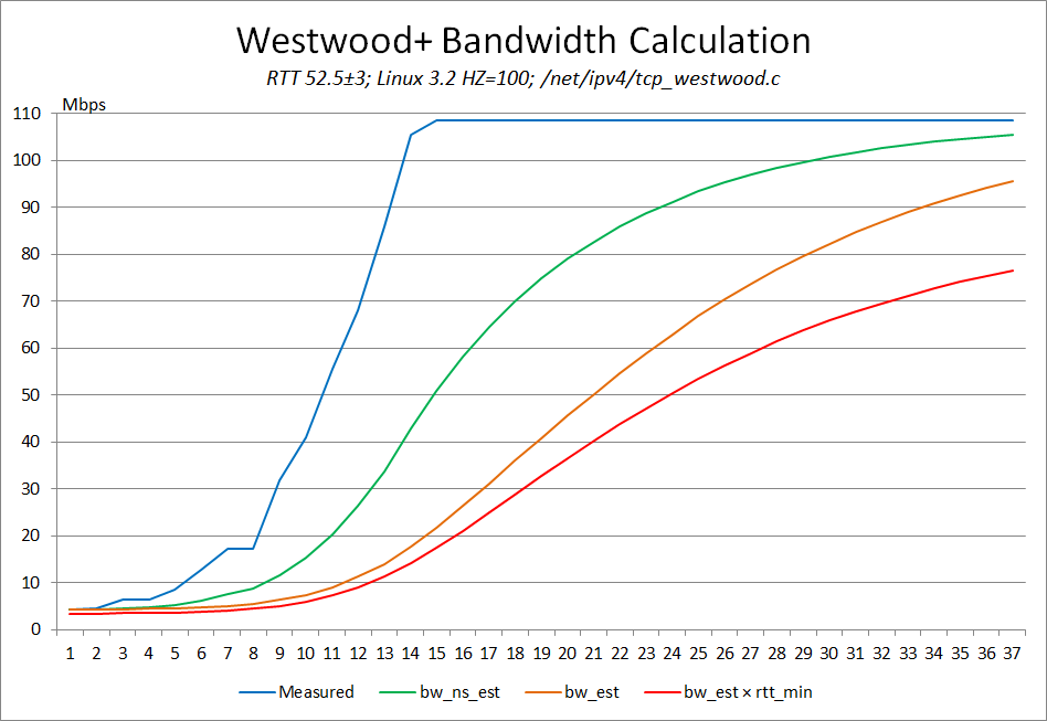 (3) bufferbloat, causing a rapid increase in RTT times (causing Westwood+ bandwidth