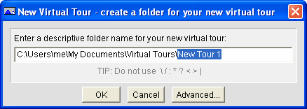 File / New Virtual Tour, create a new folder in 'My Documents',