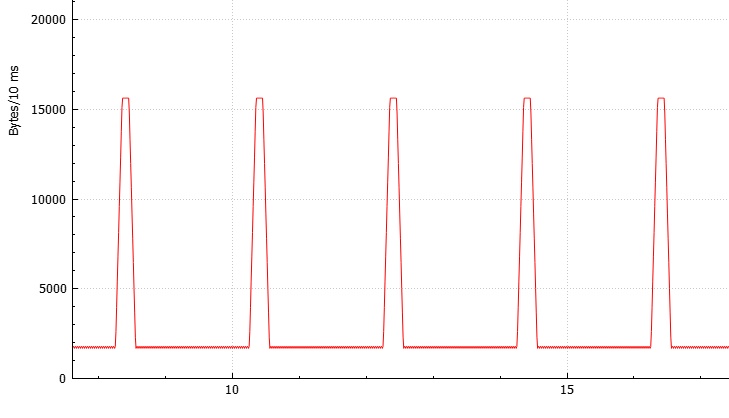 This measurement 'works' by intentionally filling the modem upload buffer to the breaking point and then adding on one final test packet, whose RTT time is then measured. The test packet must sit and wait in the modem buffer for all prior packets to egress first -- and that 'waiting' is what adds significant latency (measured by the Client when the RTT packet is echoed back).Java: Visit java.com if you don't already have the Java VM installed on your computer. To test if your computer has a Java VM installed, run the "java -version" command (valid output means yes, unrecognized command means no). Donate: If you find this program helpful, please support it with a donation. Advanced: A square-wave of UDP packets: The 'Client' command line allows for an optional second 'num-packets' and 'mstime' and 'repeat' value, which allows for a square wave of UDP to be produced. For example, this command line sends out 300 packets in 200 milliseconds, then 300 packets in 1800 milliseconds -- all repeated 30 times, which results in a 'square wave' of UDP packets: Test Results: Here are test results obtained from various locations: Interesting Arris chat answer RE buffer sizes: "The upload buffer (for UDP) in the ARRIS SURFboard SB6183 anywhere from around 128K to 150K, depending upon the ISP. This variation is almost certainly due to the fact that DOCSIS allows each ISP to customize buffer sizes in their network." The Arris SB6183 used to be the modem I used everywhere. But no longer! The buffer size in that modem is just too small, and causes problems (packet loss) for Ring cameras, and other devices -- all due to inappropriately small buffering.Hotwire Communications: An unexpected result is that Hotwire Communications in Tallahassee FL has an incredibly small amount of buffering and reverse upload bursting -- upload speed starts out slow and takes time to ramp up!